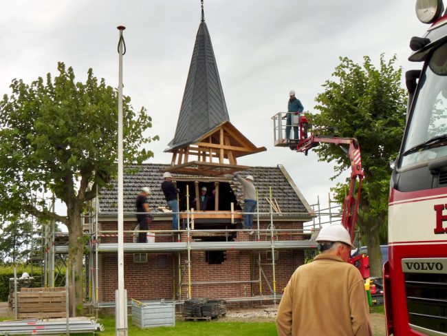 Nieuwe torenspits van het Koetshuis met Lijkenhuisje te Stedum. Het had weinig gescheeld of het in slechte staat van onderhoud verkerende Lijkenhuisje aan de Stationsweg was in de jaren `60 met de grond gelijkgemaakt. De Gemeenteraad van Stedum had er al toe besloten, maar gelukkig gaven de Gedeputeerde Staten van de provincie Groningen geen toestemming.…
