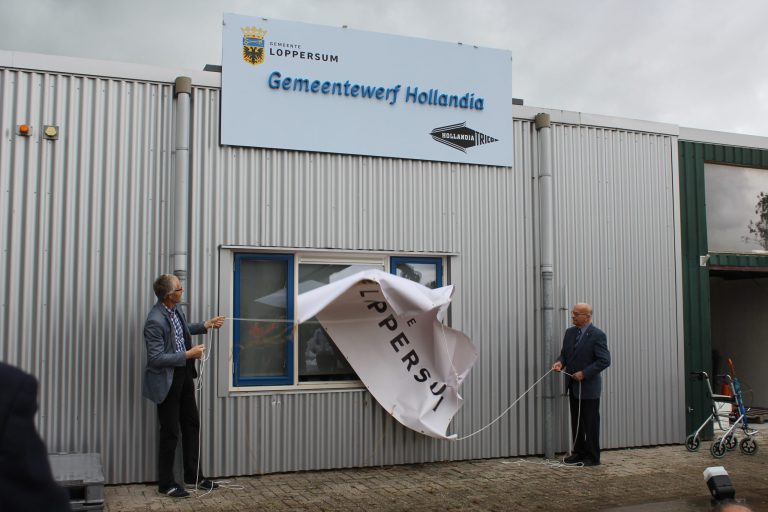Wethouder Pier Prins en Ale Zuidema, oud-medewerker van de Hollandia Tricotagefabriek in Loppersum, hebben op 30 mei 2015 de officiële opening verricht van de Gemeentewerf aan de Industrieweg in Loppersum.