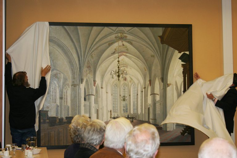 Onthulling schilderij wat in bruikleen was gegeven, voorstellende het interieur van de Petrus- en Pauluskerk in Loppersum.