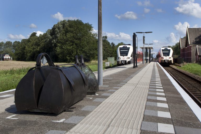 Op het perron in Loppersum staan deze kunstzinnige objecten.