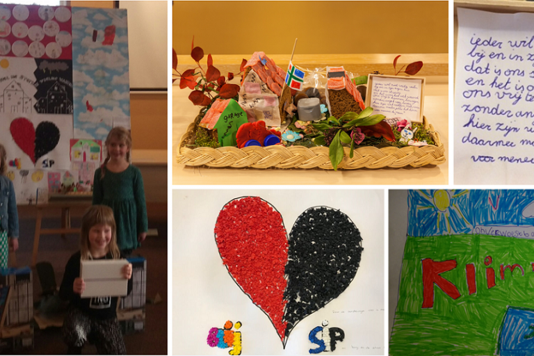 We vroegen de leerlingen: wat is er voor jou veranderd, wat vond je spannend, eng of mooi? Maak hier een verhaaltje, gedicht of een tekening van en stuur het in. Er kwamen prachtige, ontroerende en kleurrijke kunstwerken. Op de foto zie je een impressie van de prijsuitreiking op 5 maart 2018.