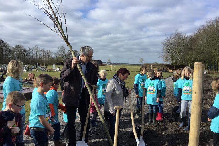 In Westeremden heeft wethouder Pier Prins (beheer openbare ruimte) samen met leerlingen van basisschool Abt Emo en Ricky van den Aker van Stichting Groninger Bomenwacht bomen geplant bij de begraafplaats in Westeremden. De jongste kinderen hebben deze ochtend bloembollen geplant op het terrein. (2018)